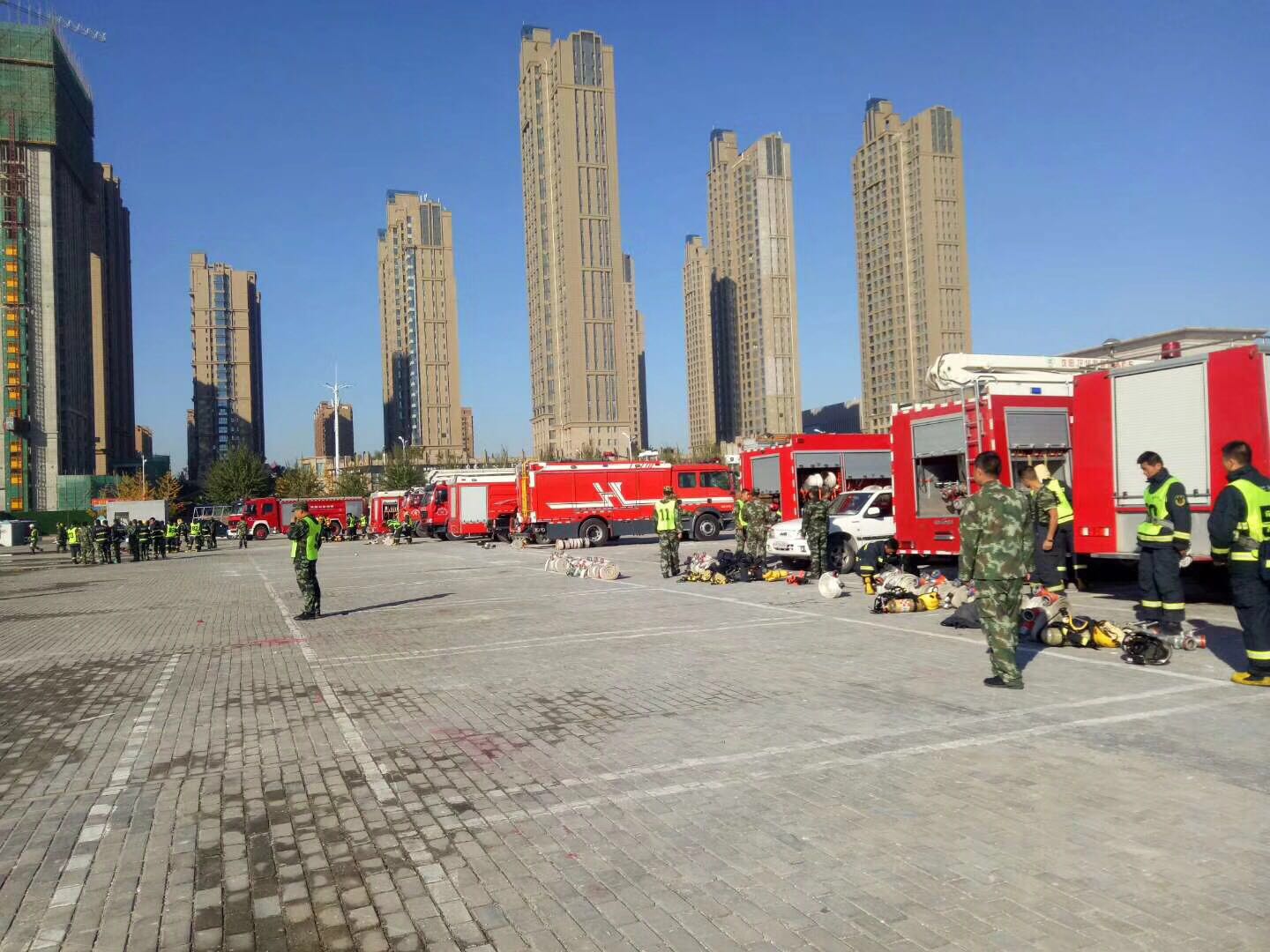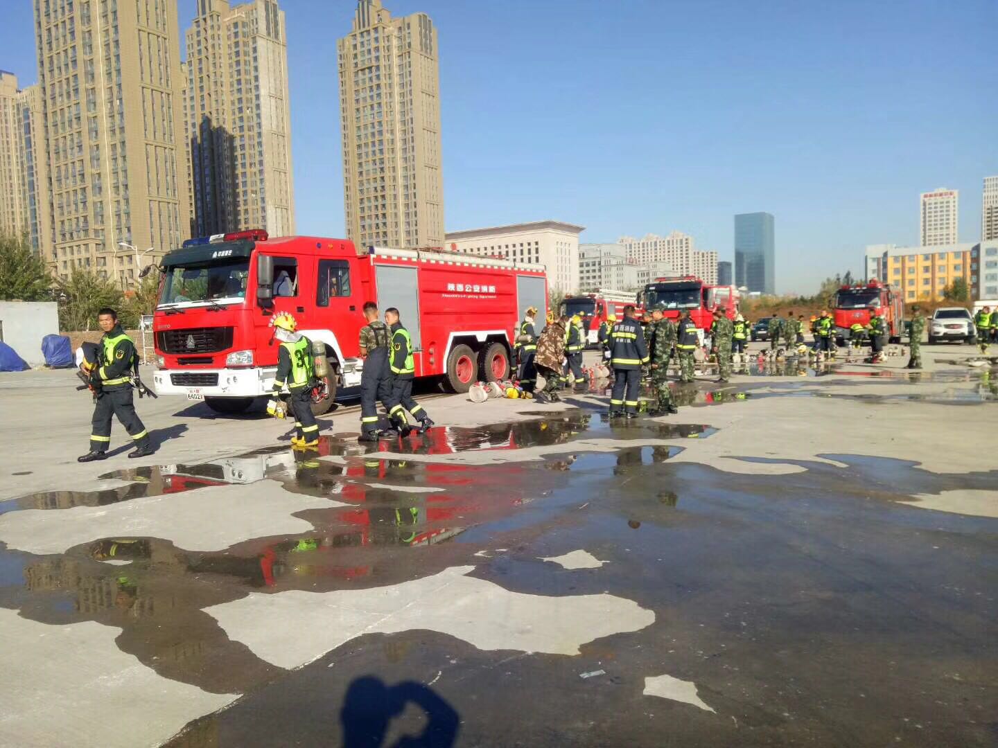 一大早、陜西榆林消防救援局在我公司采購的5臺(tái)水罐消防車、泡沫消防車等主站消防車車型便早早的開到了新區(qū)廣場附近集合、迎來首次改革后的消防工作演練、
