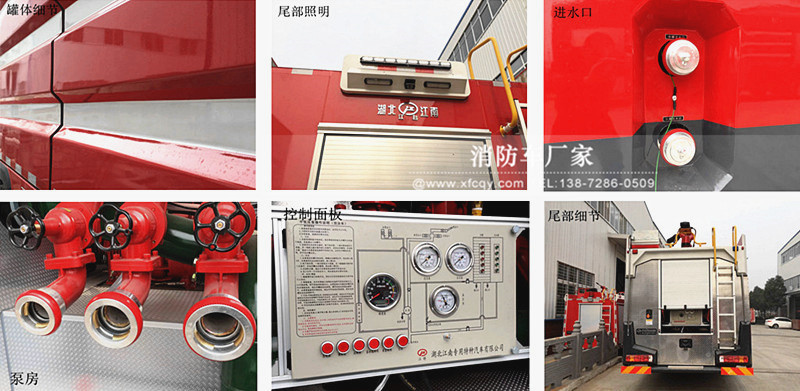駕駛室頂部前端為長排警燈,車身后配有24V/60W火場照明燈一只,車輛兩側(cè)上方各配有紅藍(lán)相配的爆閃燈,下方安裝安全標(biāo)志燈,乘員室、器材箱、 泵房內(nèi)均裝有照明燈,加裝有100W警報器,回轉(zhuǎn)警燈開關(guān)、通訊設(shè)備預(yù)備接口。